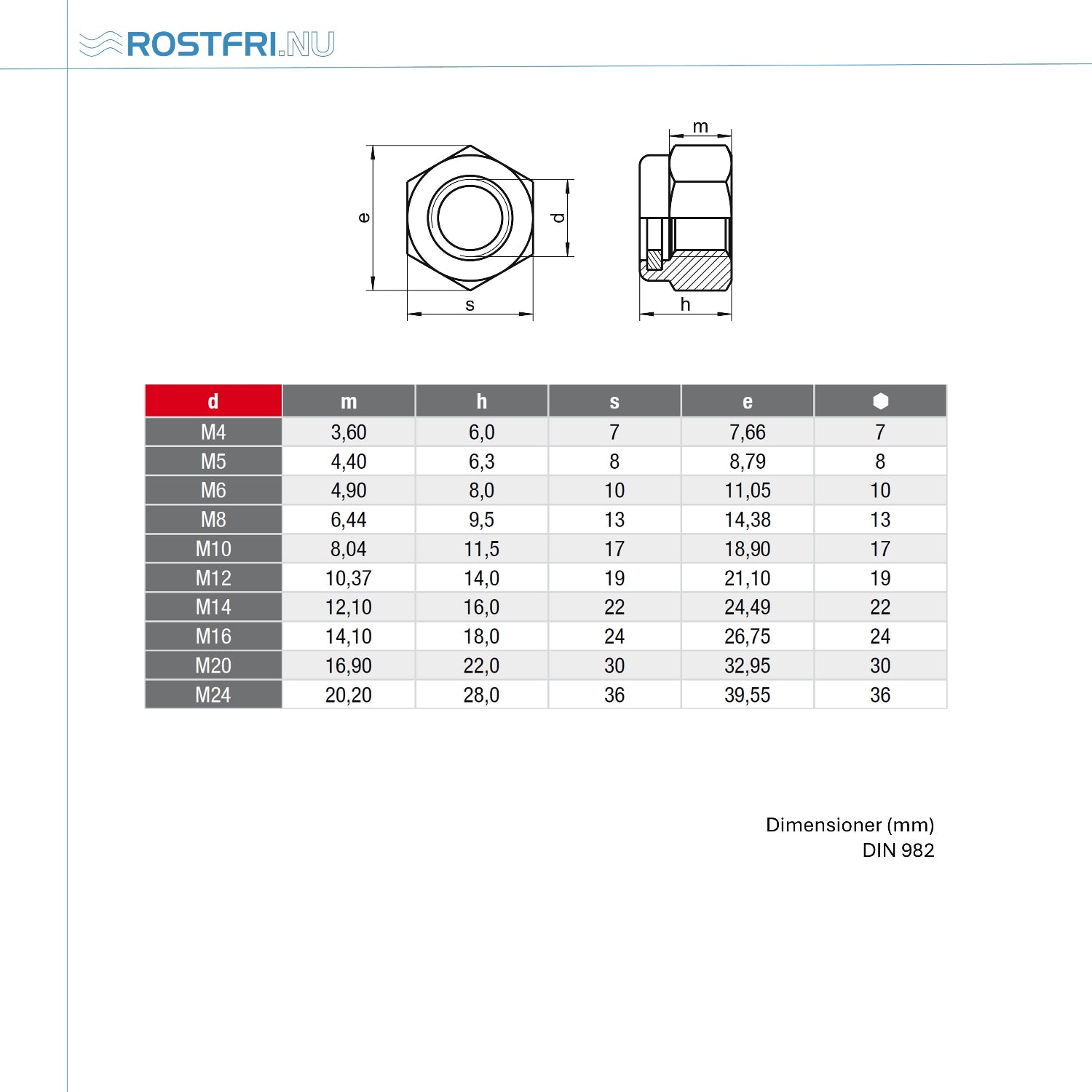 Behöver du en låsmutter som fungerar säkert även i fuktiga, salta eller kemiskt påfrestande miljöer? Låsmutter A2 DIN 982 i A2 / AISI 304 rostfritt stål med nyloninlägg är byggd för att stå emot korrosion och behålla styrkan under lång tid. Nyloninlägget skapar ett konstant friktionsmotstånd som förhindrar att muttern lossnar vid vibrationer och mekanisk belastning, samtidigt som den är enkel att montera med standardnyckel.