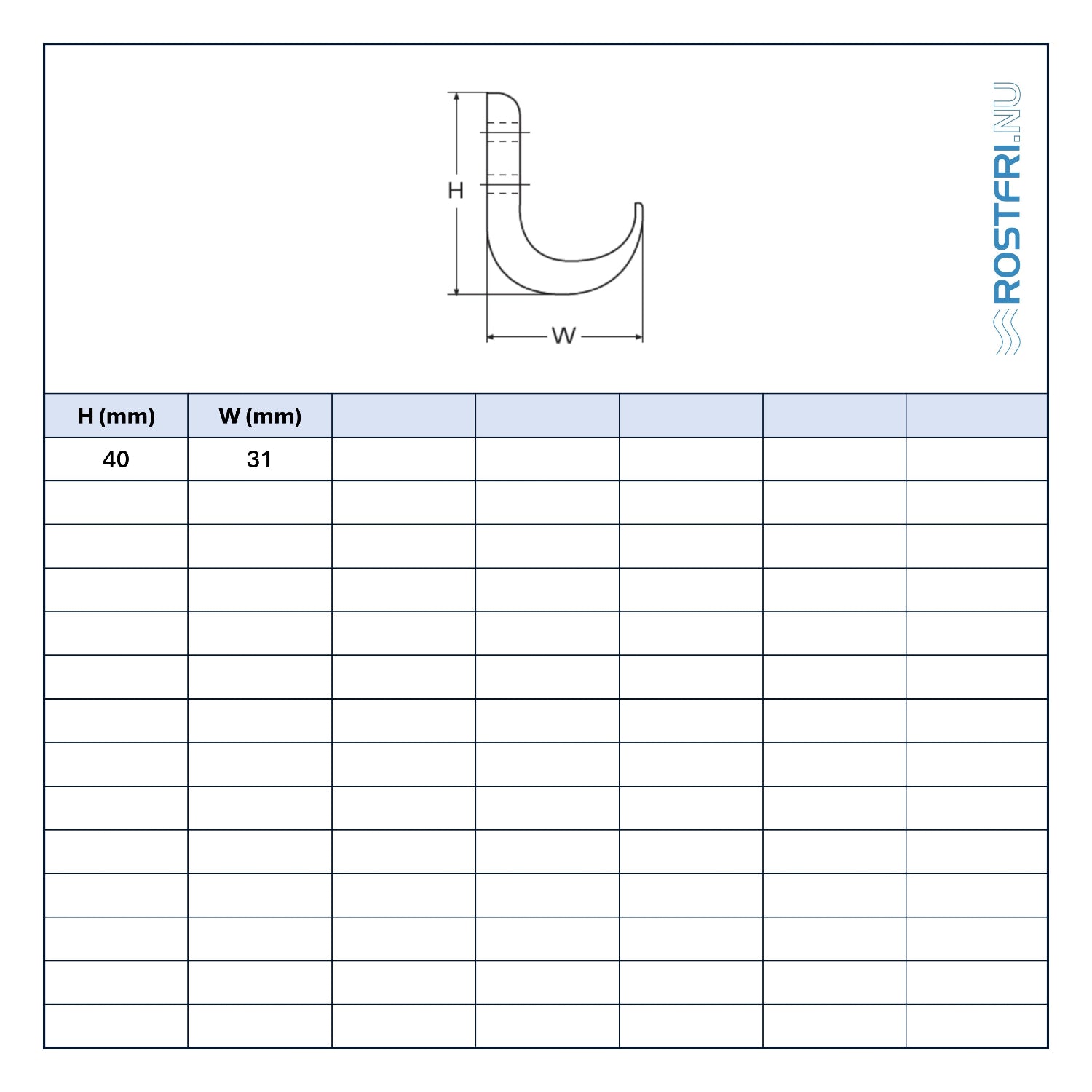 Klädkrokar rostfritt stål A4 är en högkvalitativ lösning för att organisera dina kläder och tillbehör. Tillverkade av rostfritt stål, dessa krokar är hållbara, rostbeständiga och har en stilren design som passar i alla miljöer. Välj mellan 1 eller två hål för montering. Krokarna har en polerad yta som förhindrar repor på kläderna och säkerställer långvarig användning.