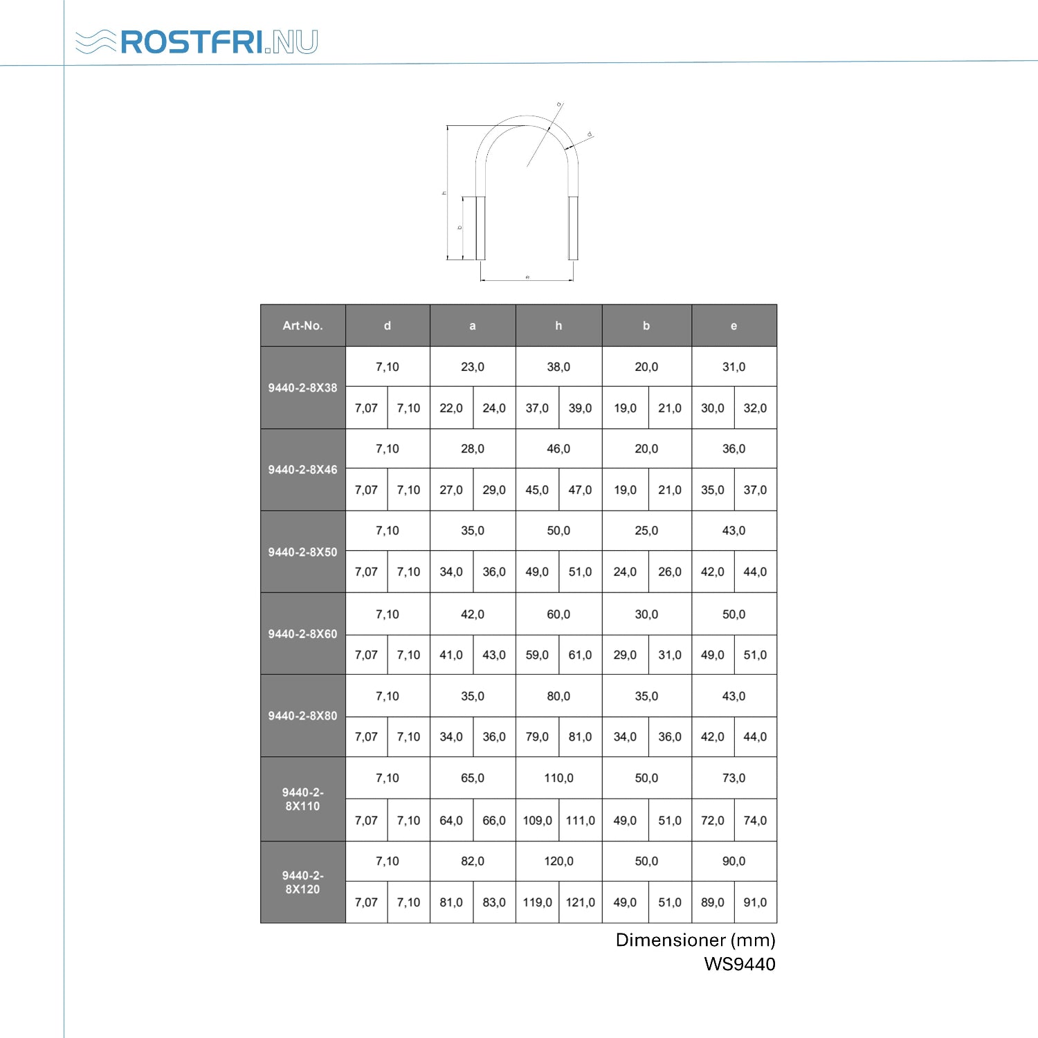 Om du söker en U-bygel som klarar direkt förankring och upphängning i krävande miljöer utan att rosta, är detta ett tillförlitligt val. WS 9440 är tillverkad av A2 / AISI 304 rostfritt stål och motsvarar DIN 3570 form A i utförande. Konstruktionen är utvecklad för att stå emot fukt, vatten och måttligt aggressiva miljöer. Används där hållbarhet och korrosionsbeständighet är avgörande – särskilt i industriella miljöer, utomhusinstallationer och ventilationssystem.