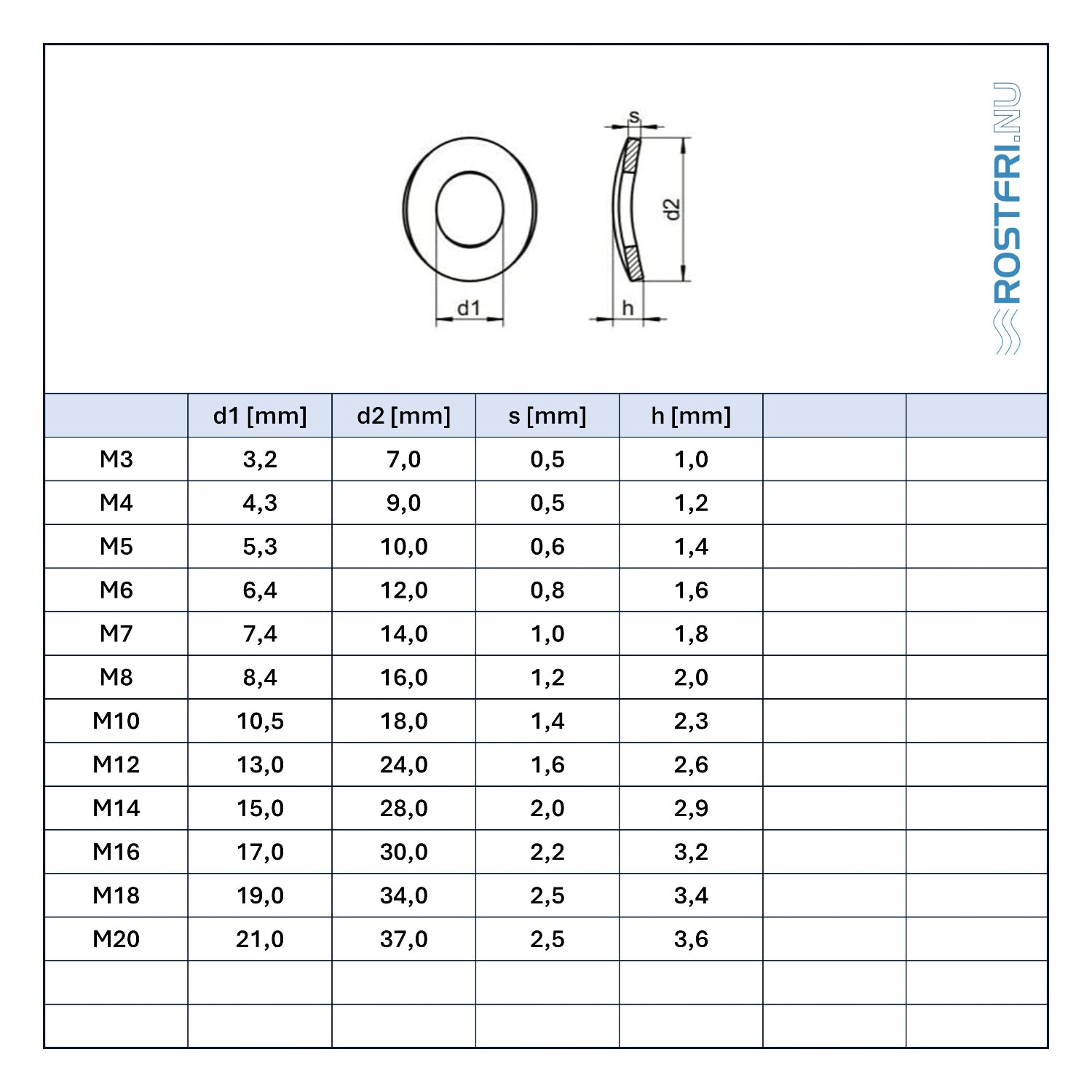 Om du söker en fjäderbricka som klarar direkt tryckupptagning och vibrationsdämpning i krävande miljöer utan att rosta, är vågformad fjäderbricka DIN 137 i rostfritt stål ett tillförlitligt val. Den är tillverkad av A2 / AISI 304 rostfritt stål och konstruerad för att tåla fukt, salt, kemikalier och temperaturväxlingar. Produktens design inkluderar en vågformad brickkropp som ger en fjädrande effekt och kompenserar för rörelser, temperaturväxlingar och sättningar i förband. Den möjliggör enkel montering tillsammans med standardgängade fästelement som bultar och skruvar. Vågformad fjäderbricka DIN 137 används där hållbarhet och korrosionsbeständighet är avgörande – särskilt i marin, industriell eller utomhusmiljö.